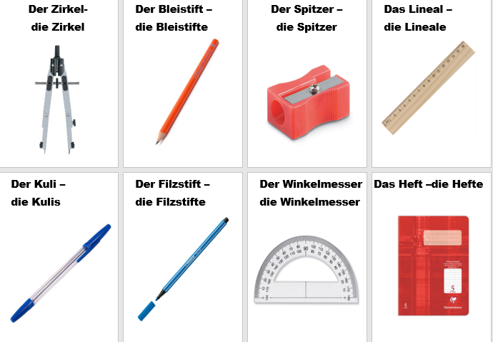 Wir lernen neue Wörter. Das Thema "Schulsachen". Hier kann man eine Präsentation und Bilder mit Namen anschauen .